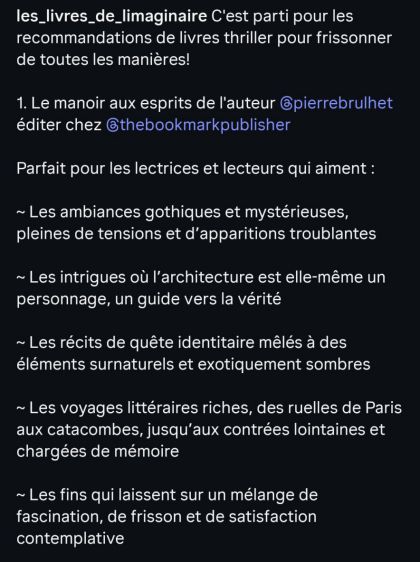 Que vous soyez un amateur de récits gothiques, un passionné de mystère ou simplement à la recherche d’un roman qui vous transportera, Le Manoir aux Esprits est fait pour vous. La version rééditée par The Bookmark Publisher est une porte d’entrée idéale pour découvrir ou redécouvrir l’univers envoûtant de Pierre Brulhet.
